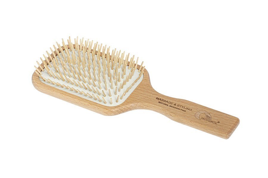 Kvalitní dřevěný kartáč vhodný pro dlouhé vlasy. Dřevěné ostny zapuštěné do pneumatického gumového podkladu zajišťují lepší "pružení" a pohodlnější česání hustých a dlouhých vlasů - kartáč má až 11 řad ostnů.
