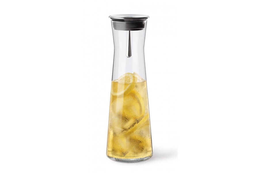 Skleněná karafa na domácí limonády. Sítko zabudované ve víku zabrání proniknutí kouskem citronu, máty, meduňky a podobně.