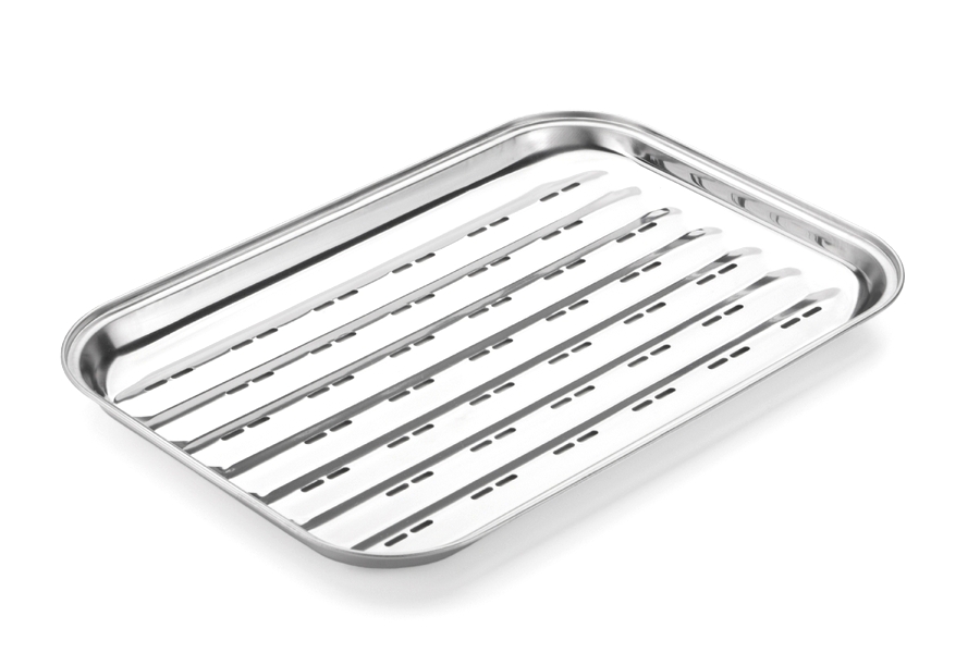 Tác na grilování z vysoce leštěné nerezavějící oceli.