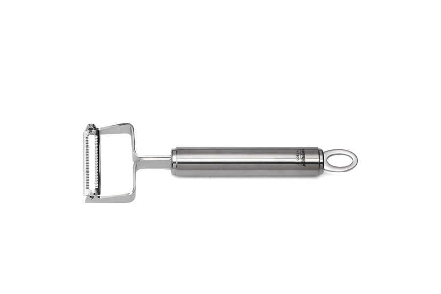 Nerezová škrabka na zeleninu s ostrou a pohyblivou čepelí s jemnou tloušťkou řezu.