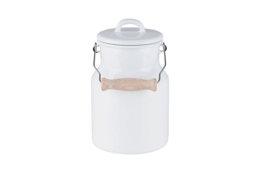 Smaltovaná konvice na skladování a přepravu (nejen) mléka. Víčko je smaltované a rukojeť dřevěná.