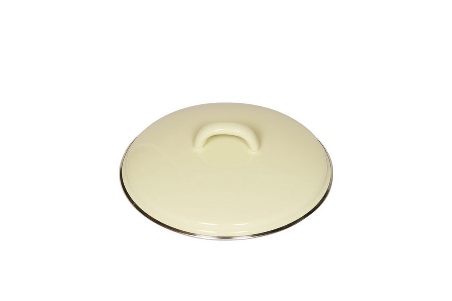 Smaltovaná poklice s chromovým okrajem pasuje na hrnec stejné světle žluté barvy.